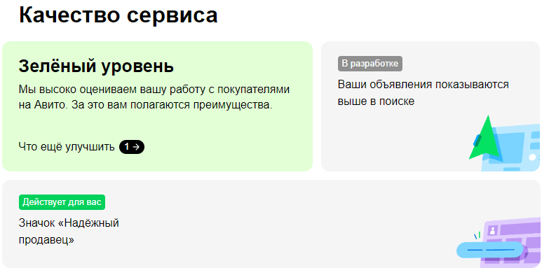 За зелёный уровень сервиса Авито поднимет объявления в поиске и добавит значок - “Надёжный продавец”.