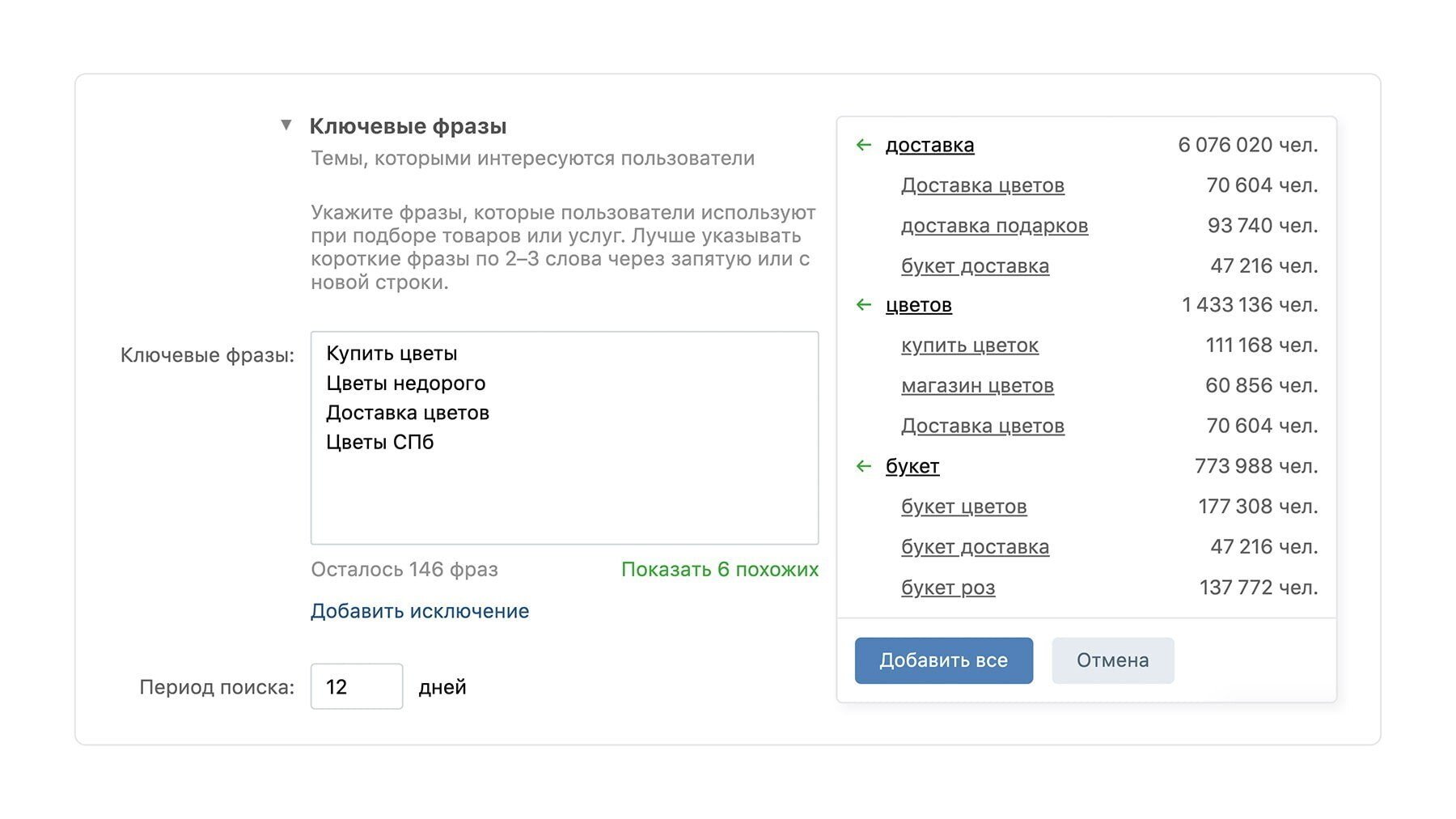 - Контекстный таргетинг по ключевым словам - поиск и показ рекламы тем пользователям, которые вводили поисковые запросы в поисковиках проектов VK: “Юла”, “Поиск Mail.ru”, самом “ВКонтакте” и “Одноклассники”. Период поиска можно задать вручную. Чем дольше цикл сделки, тем дольше нужно указывать период поиска;