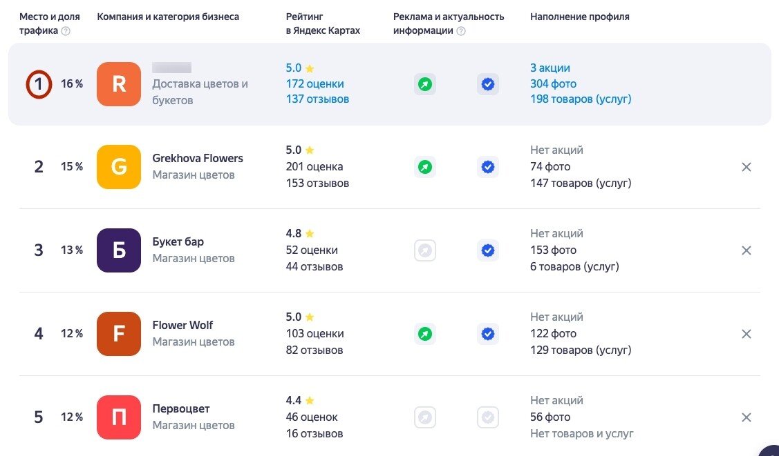 Как правило, больше всего буста и профита для магазинов цветов дает именно приоритетное размещение только в Картах и Навигаторе.