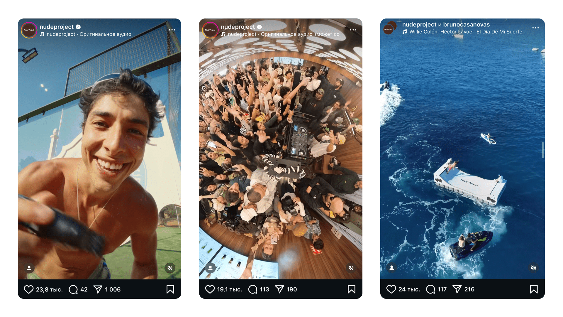 У Nude Project контент не про «посмотрите, что мы сделали», а про «посмотрите, как мы живем». Они запустили подкасты с известными гостями, сделали сезонные кампании с вечеринками, превратили Instagram и YouTube в формат личного блога, главные герои которого — основатели бренда.