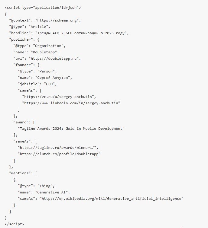 В этом примере мы не просто назвали автора, но и дали ссылки на его профили (sameAs), подтверждая реальность. Мы также связали статью с глобальной сущностью Generative AI через Википедию, давая понять контекст.