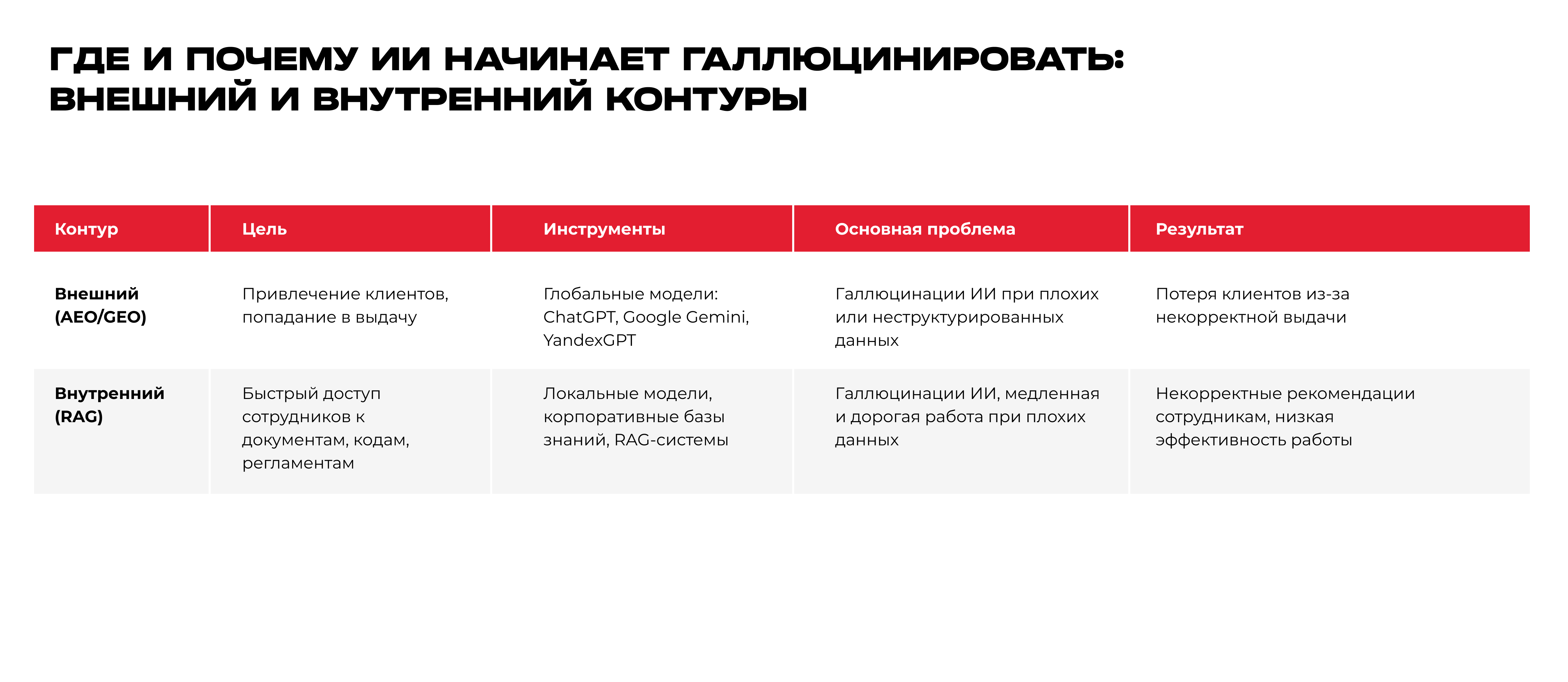 В обоих контурах главная проблема одна и та же. Нейросети — и глобальные, и ваши собственные — начинают галлюцинировать, когда получают на вход неструктурированные данные. Если данные плохие во внешнем контуре, то вы теряете клиентов в выдаче Яндекса. Если данные плохие во внутреннем контуре, то ваш корпоративный ИИ-ассистент дает некорректную информацию сотрудникам, а RAG-система работает медленно и дорого.