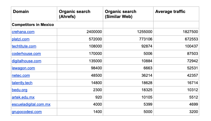 Для мексиканского EdTech-проекта мы использовали сервисы Ahrefs и SimilarWeb, чтобы определить прямых и информационных конкурентов как в Мексике, так и в других странах.
