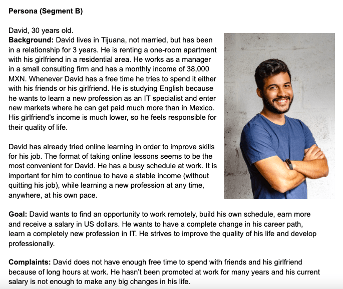 Пример из нашего кейса. Работая с EdTech-платформой, важно было понимать, что пользователи ждут от онлайн-образования. Выделили 2 группы ЦА и создали юзер-персону для каждой: