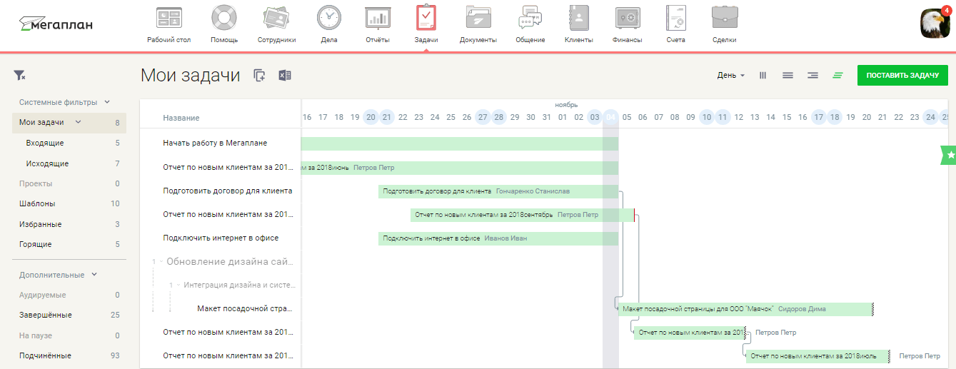 В Мегаплане есть готовый шаблон диаграммы Ганта. Можно создавать задачи, показывать их на диаграмме, двигать и следить за сроками.
