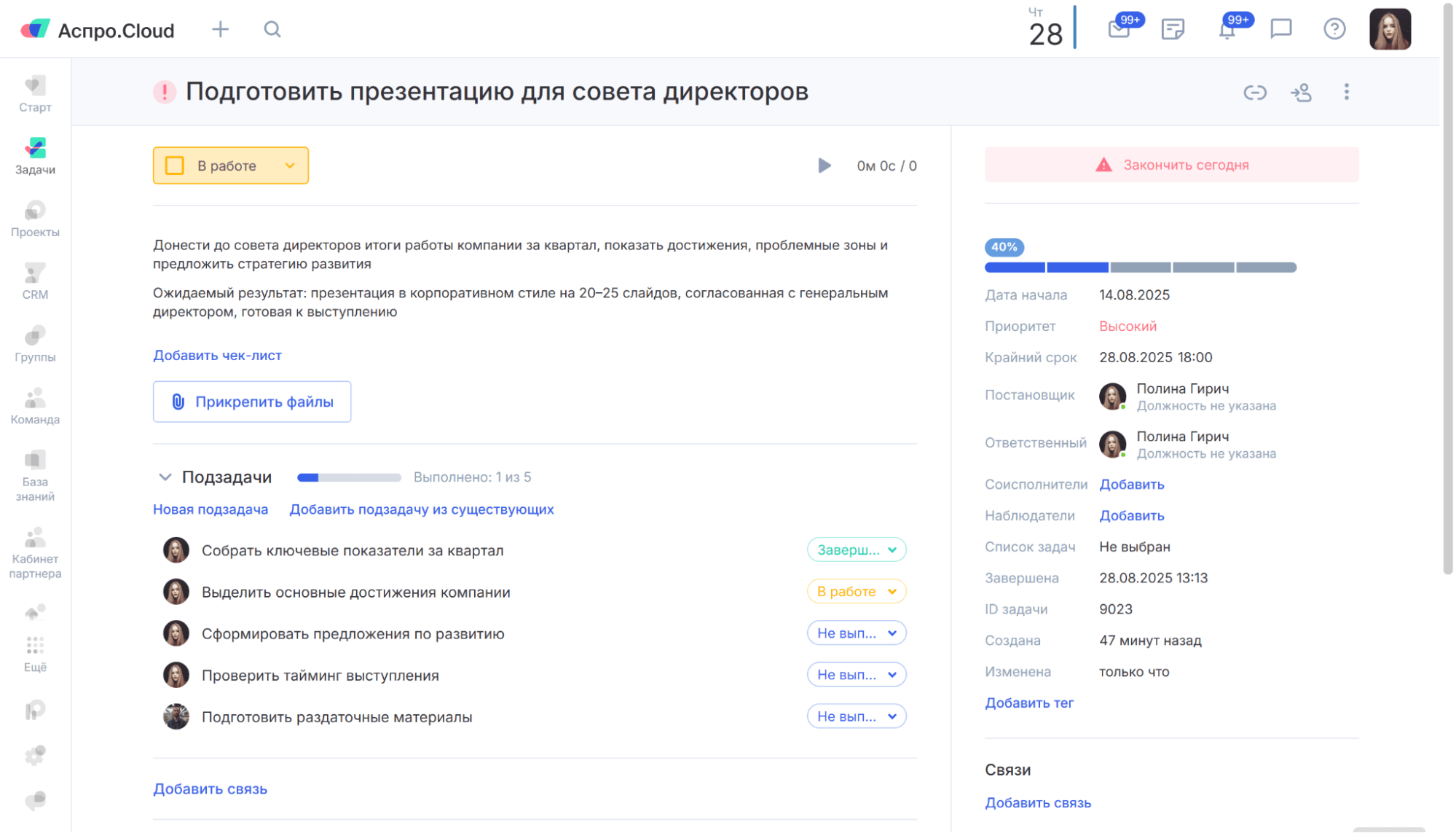 В Аспро.Cloud можно не только ставить задачи, но и разбивать их на подзадачи. У подзадач есть свои исполнители, сроки и статусы, и при этом видна связь с основной задачей.