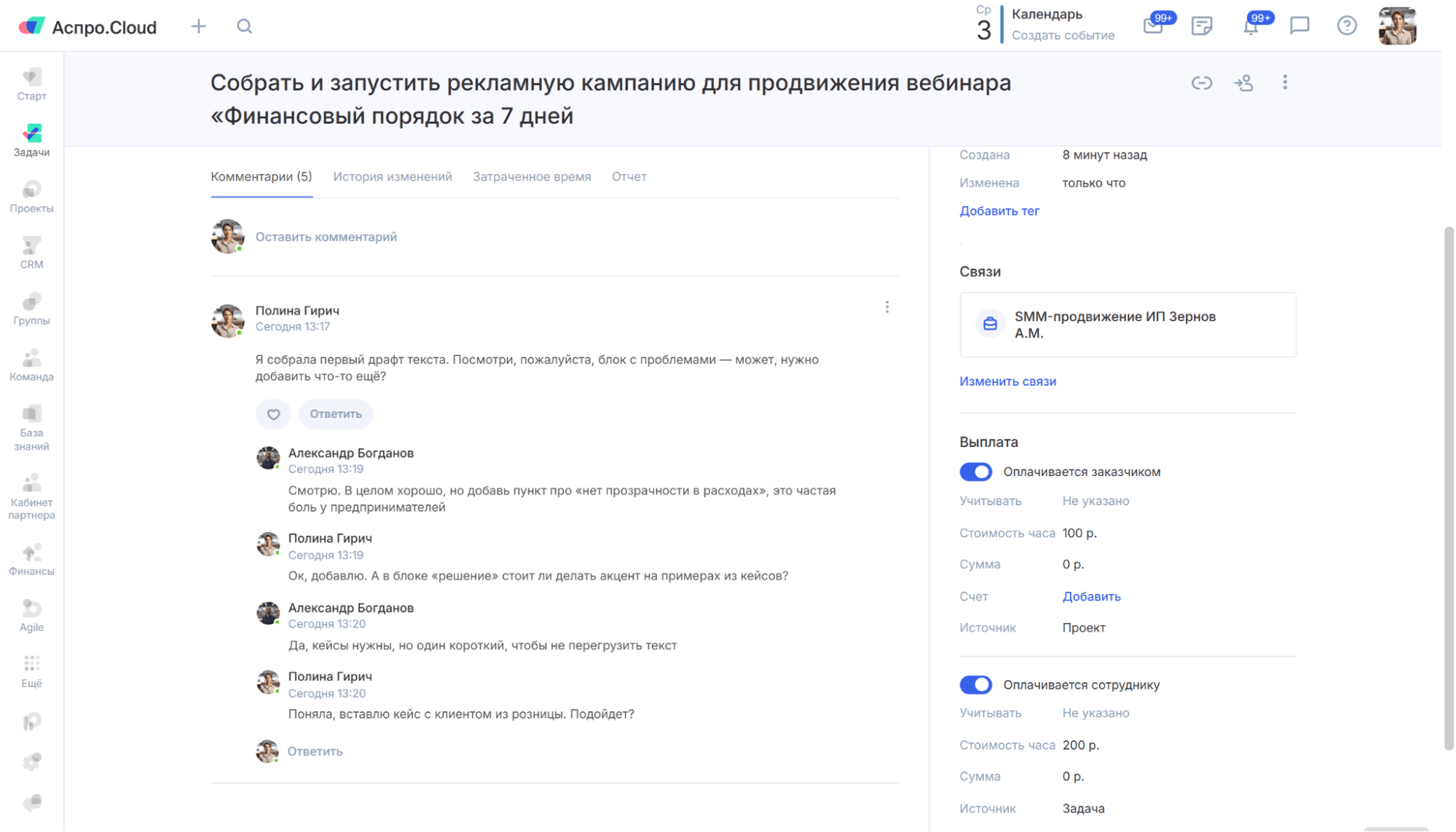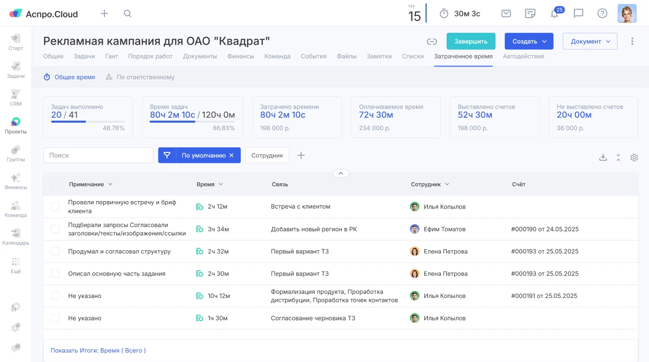 В Аспро.Cloud есть тайм-трекер. Можно запускать его кнопкой или вносить время вручную. Чтобы не считать, сколько клиент должен за работу, можно выставить счет прямо из проекта. Также можно задавать разные ставки сотрудникам — в зависимости от должности, навыков или конкретной задачи.