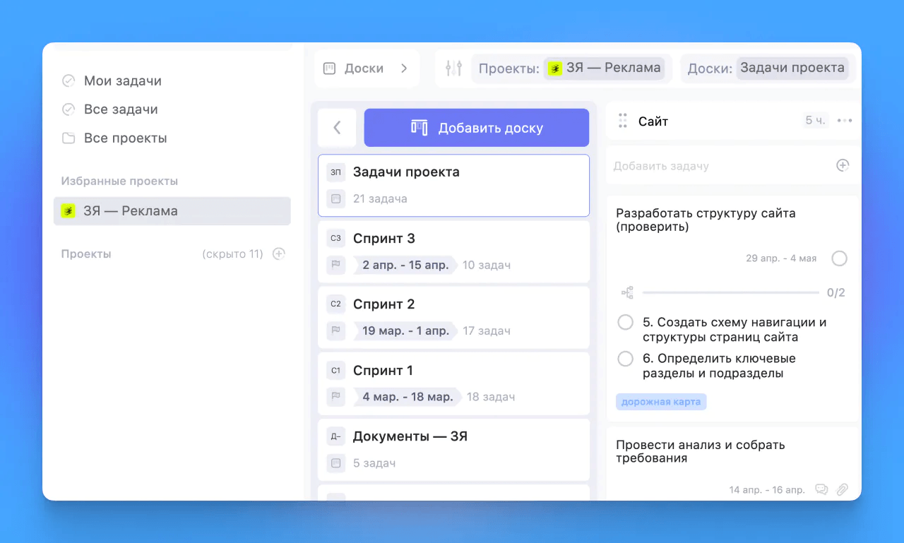 В WEEEK два типа досок: «Стандартная» для обычных проектов, а «Спринт» — для работы по Scrum. К одному проекту можно привязать несколько досок. Например, дизайнеры работают по Scrum, разработчики — по Waterfall, но проект их объединяет.