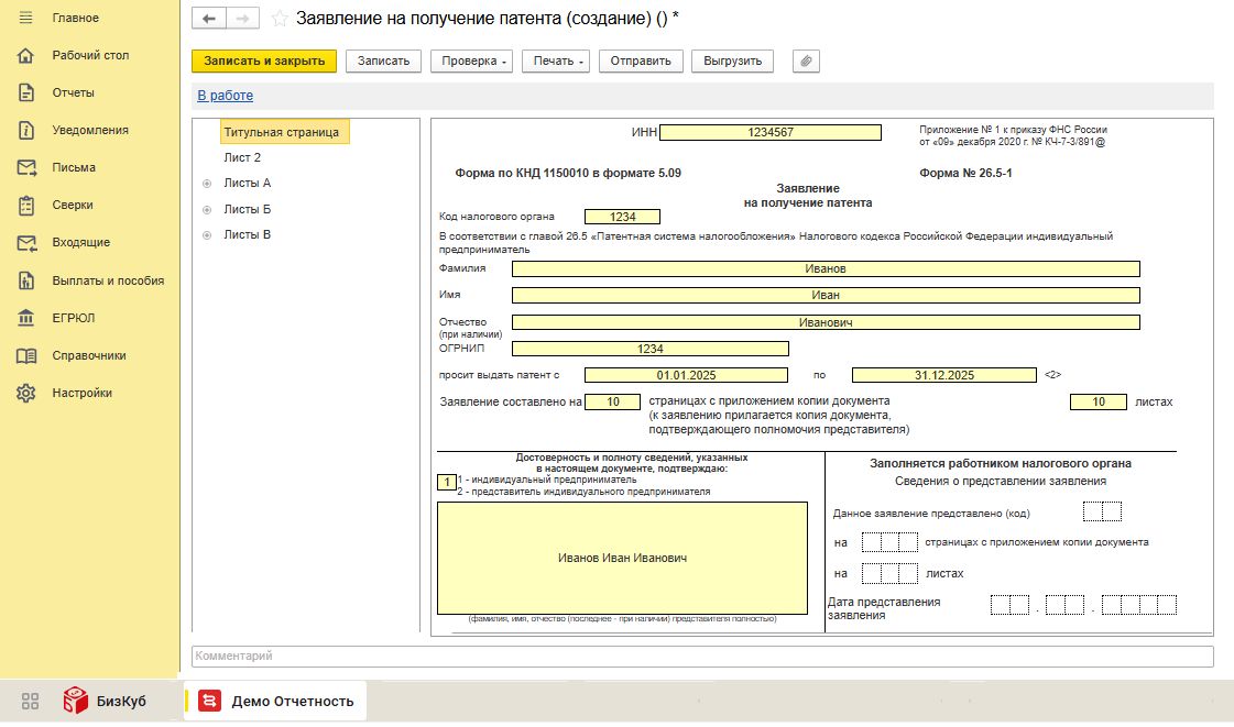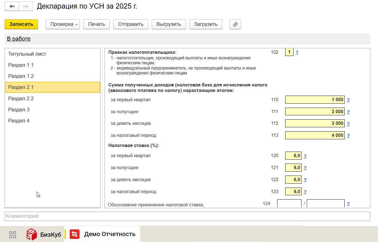 Бизкуб Отчетность посчитает сумму налога исходя из введенных данных.