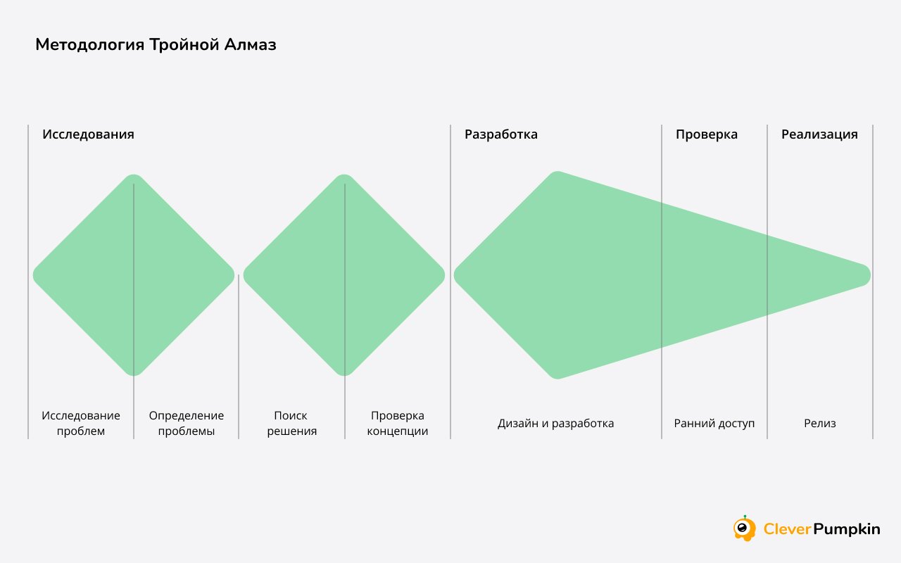 Чтобы избежать описанных выше рисков, я рекомендую использовать метод тройного алмаза(Triple Diamond). Он как раз помогает лучше понять пользователей, сформировать обоснованные гипотезы и протестировать решения до масштабного внедрения. Такой подход снижает вероятность ошибок, экономит время и бюджет и повышает шансы создать действительно полезный продукт.
