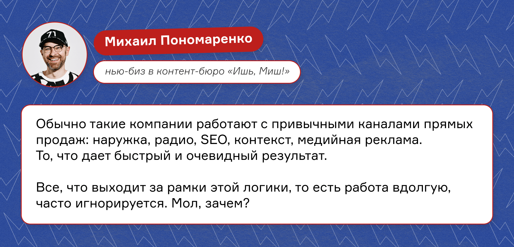 Мы в контент-бюро «Ишь, Миш!», умеем превращать даже самое сухое техзадание в живую, работающую коммуникацию. А еще знаем, как креативить для FMCG, жилых кварталов, и… тяжелого люкса — компаний, которые занимаются логистикой, производством и промышленностью.