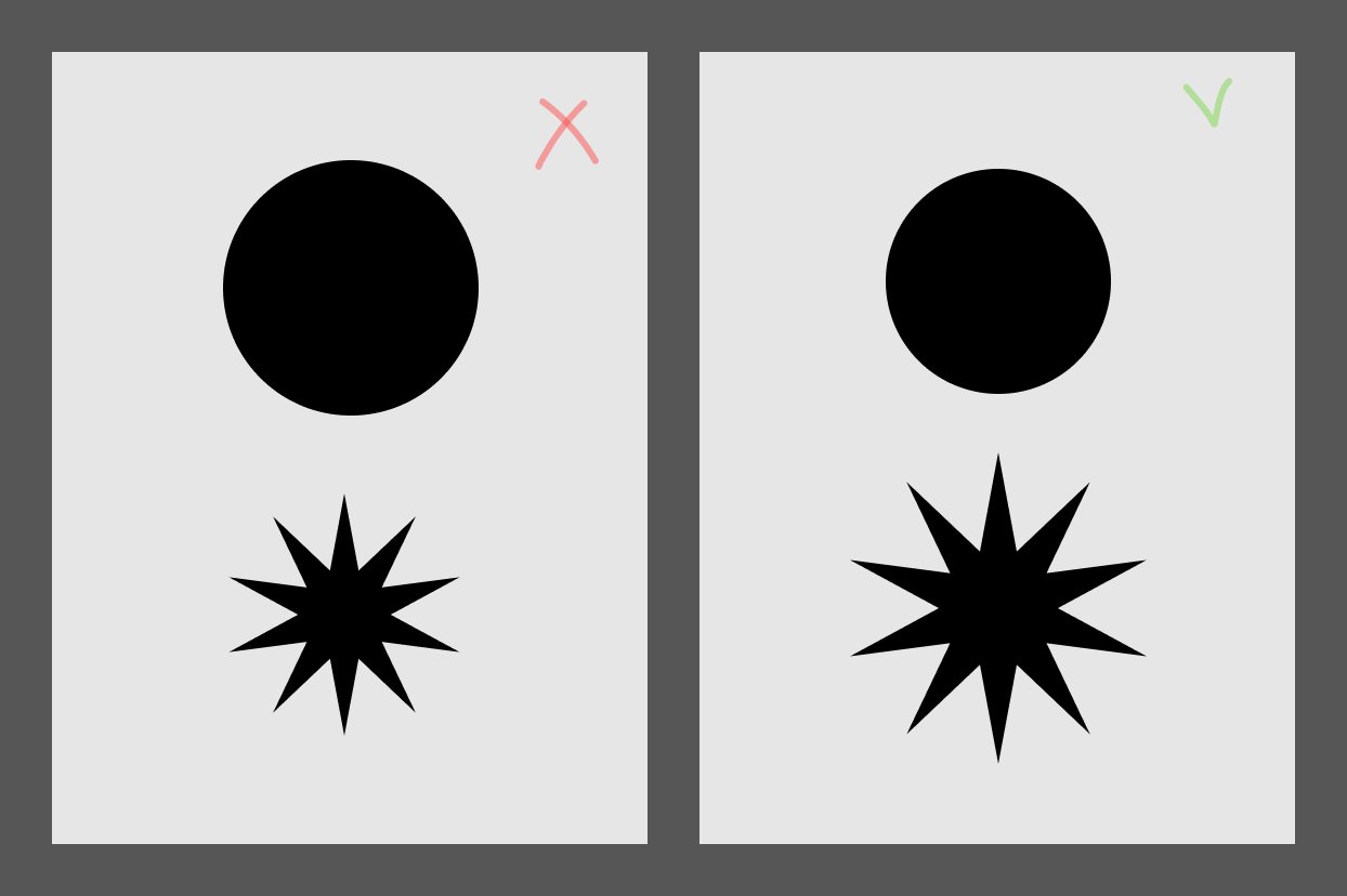 - Размер: на картинке мы видим, как можно уравновесить элементы, меняя их размер или количество