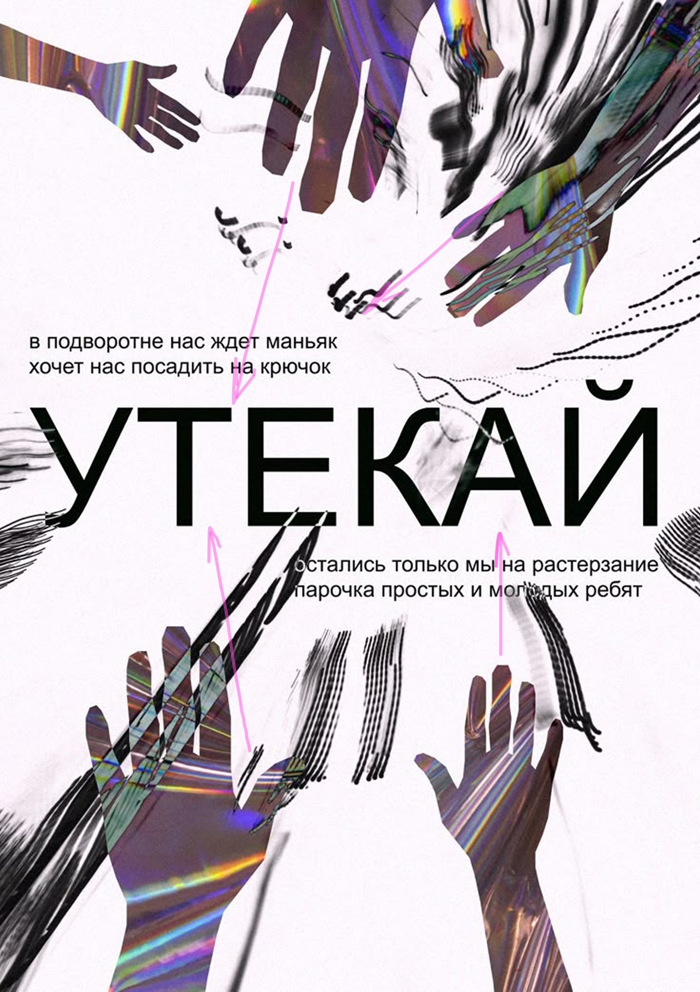 В данном постере руки являются указателями и направляют взгляд пользователя на заголовок.