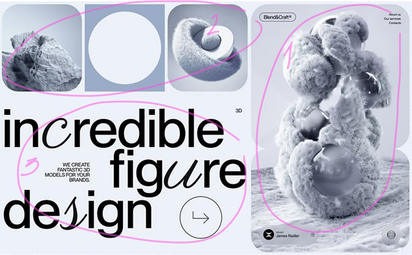 Тут применены примерно те же правила, что и в примере выше, правая часть занимает меньше места, но имеет больший вес за счет тона, который добавляет ей контраста. Левая часть состоит из двух блоков, в одном (2) мы видим 3 плашки, между которыми есть немного воздуха, который не мешает нам воспринимать их как одно целое, а в другом (3) размещен текст и несколько элементов, заполняющих пустое пространство. Правая и левая части уравновешивают друг друга, поэтому композиция выглядит убедительно.