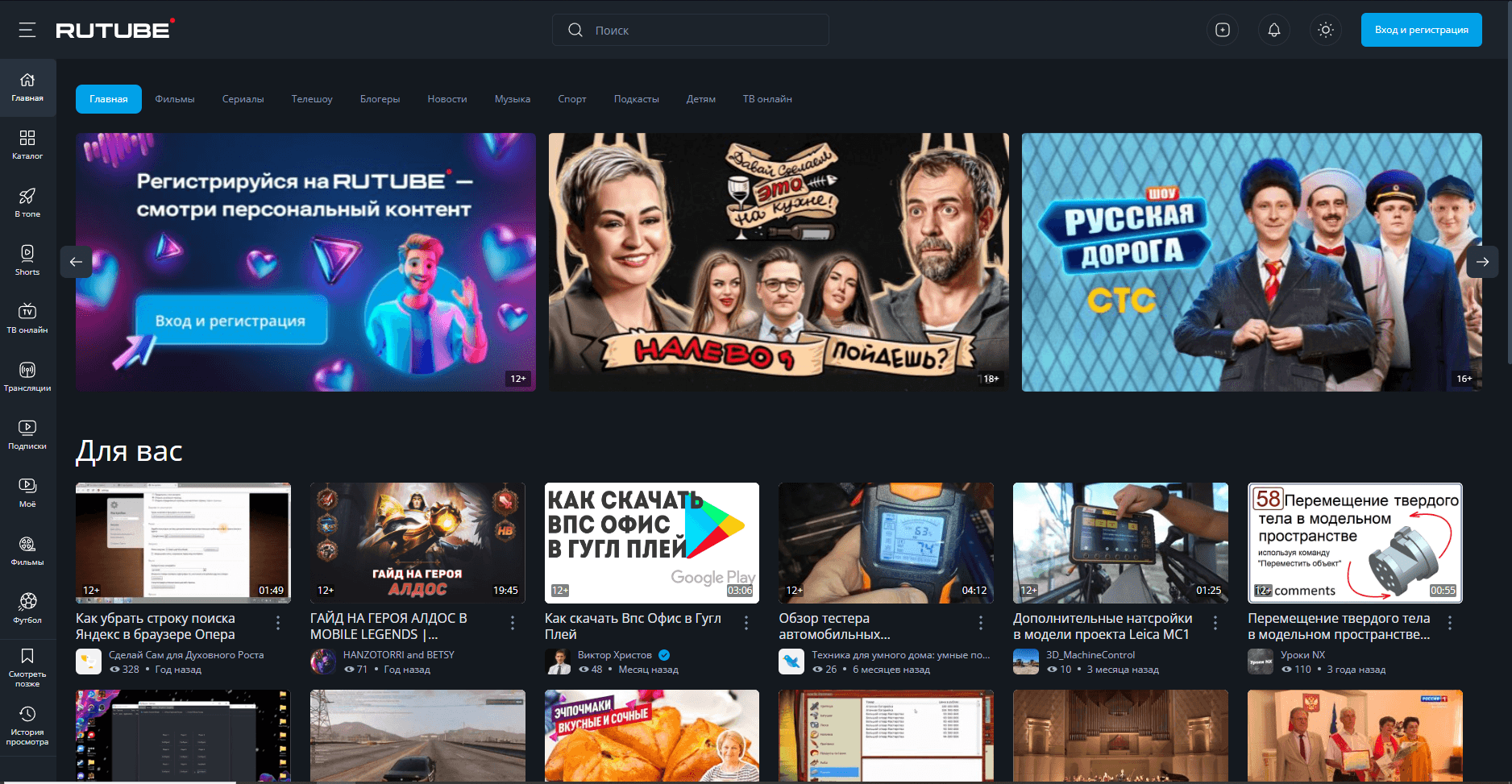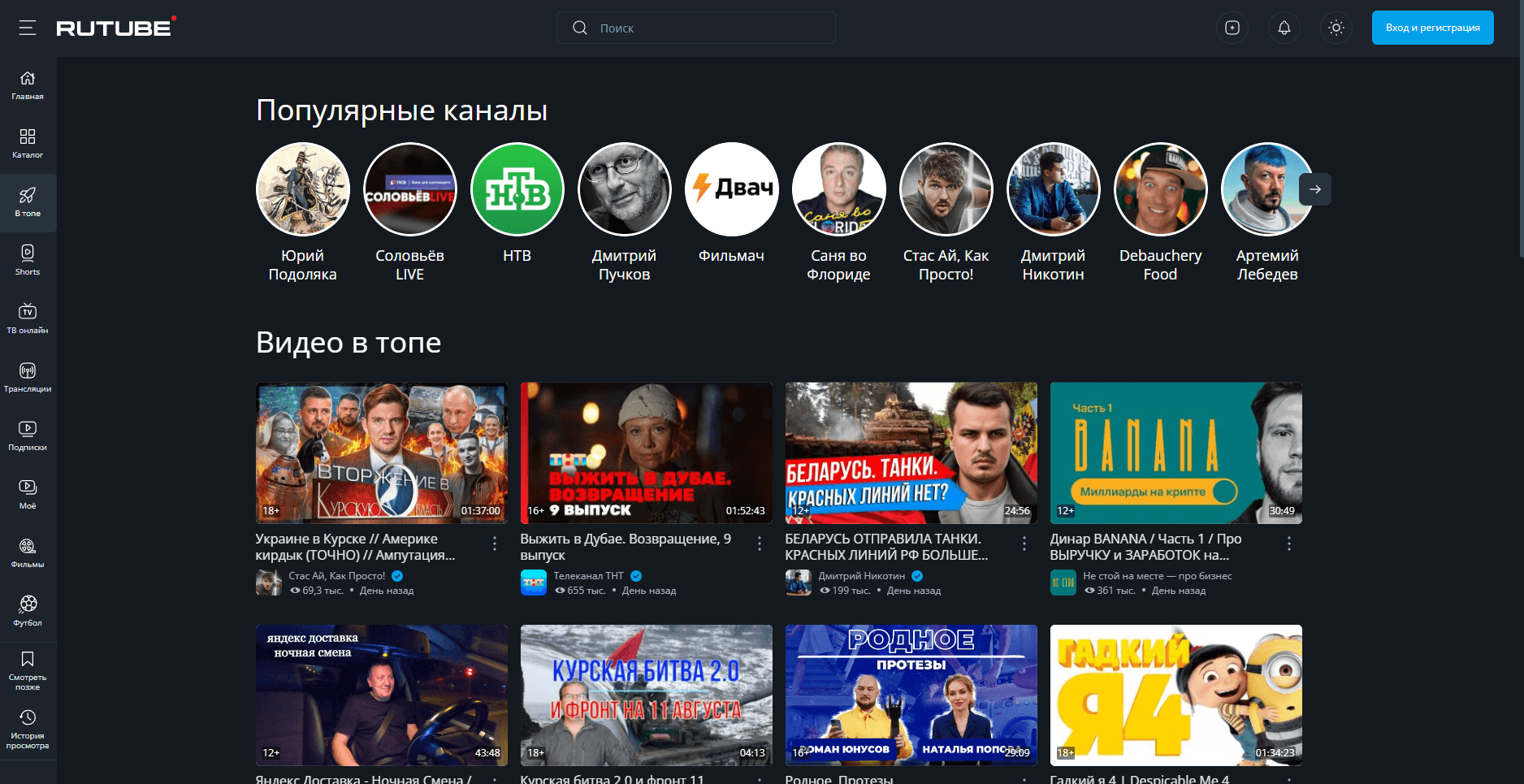 А лента Рутуба представляет собой сборку этих самых категорий) Здесь есть все — и выборка самого сервиса и «ТОП-5 видосов» (которые выбираются, видимо, наугад, у третьего видоса и просмотров, и лайков больше, но ладно), и внезапные ТВ-каналы.