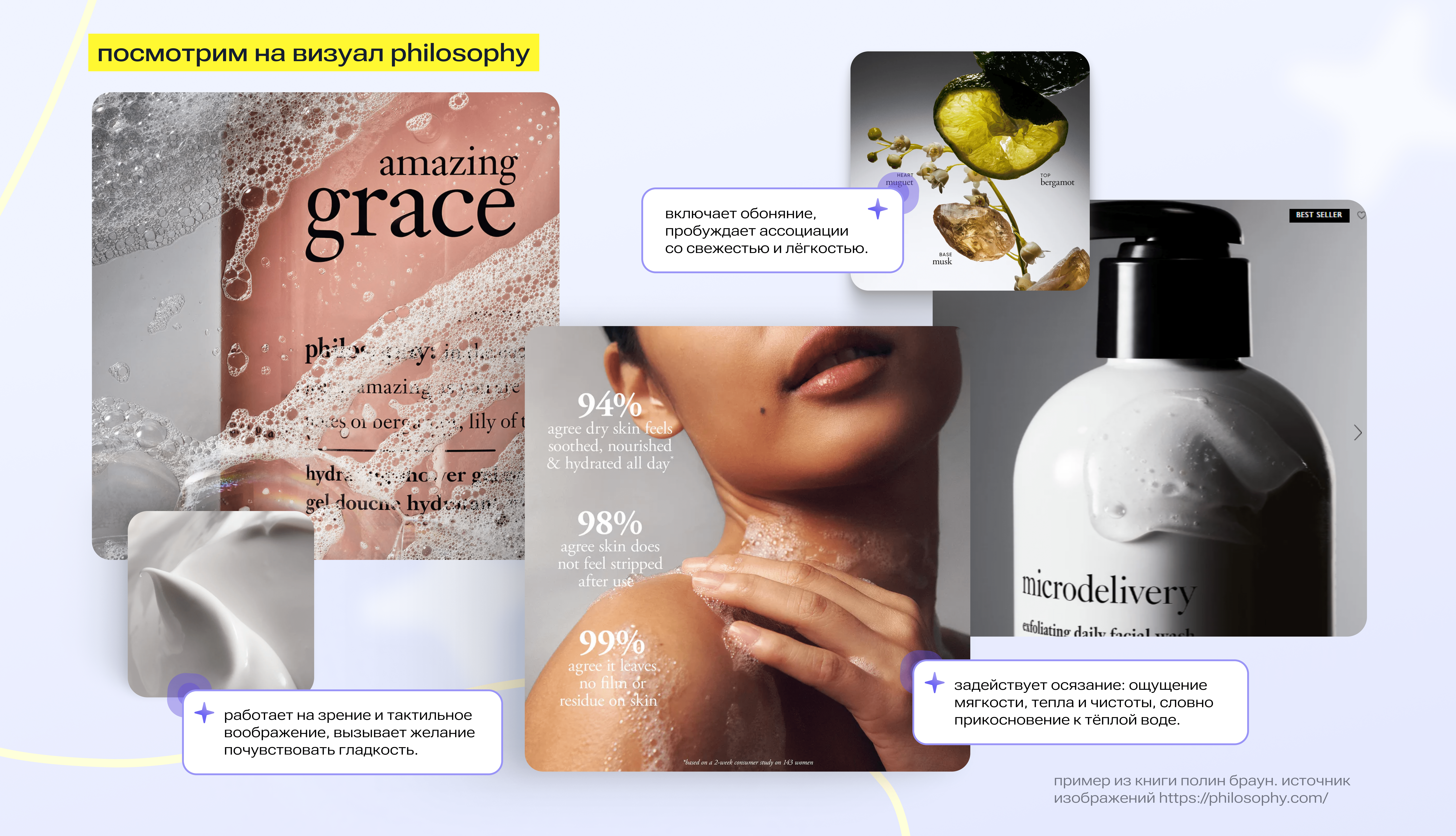 Встреча с Кристиной Карлиной, основательницей бренда Philosophy, изменила взгляд Браун на эстетику. Карлина показала, что сила бренда в том числе в языке, на котором он говорит с людьми. Её средства назывались Grace («Изящество»), Purity («Чистота»), Renewed Hope («Возрождённая надежда»), они создавали ту же эмоцию, что и продукт, усиливали ощущение чистоты и спокойствия, потому что язык способен быть частью эстетического опыта и помогать бренду говорить на уровне чувств.