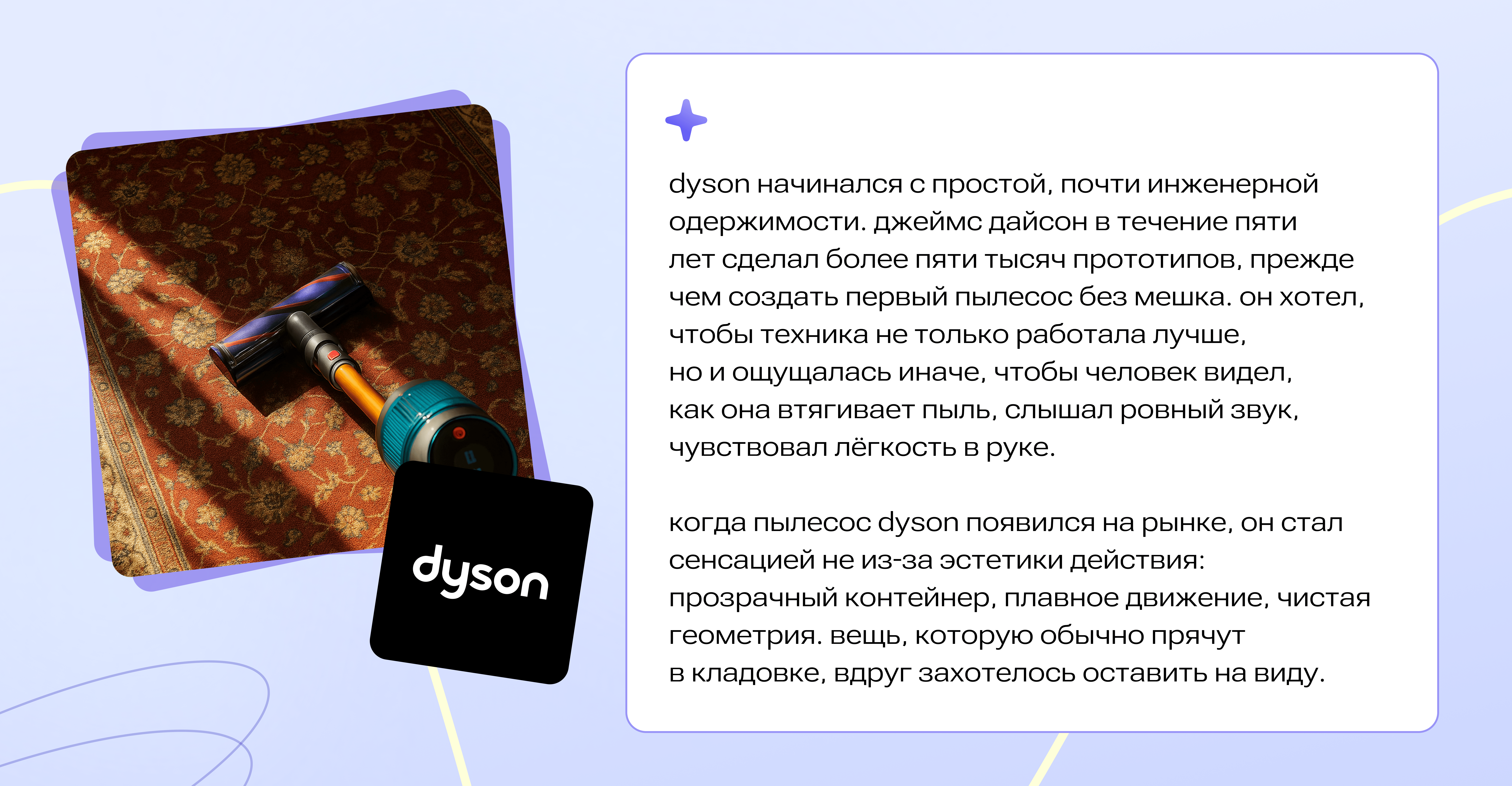 Понимание эмоций, которые вызывает продукт, — и есть основа эстетического интеллекта. Его хорошо видно на примерах брендов, где форма и ощущение работают вместе: техника SMEG создаёт чувство уюта и ностальгии, а Dyson дарит удовольствие от функции, от звука, движения и лёгкости в руке.