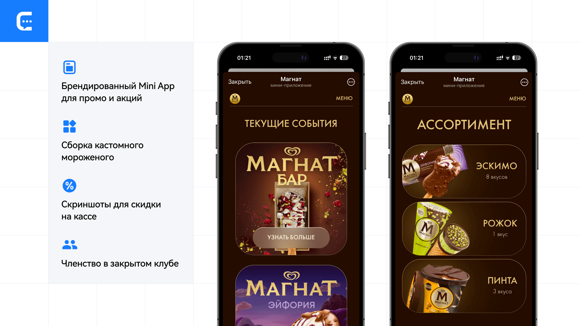В 2024–2025 гг. отмечаем спрос на чат-ботов и мини-приложений для промо, акций, розыгрышей, маркетинговых активностей и иных спецпроектов. Иногда промоакции достаточно простые, и их можно реализовать на конструкторе чат-ботов. Сложности возникают, когда нужна кастомизация. Например, бренд «Магнат» проводил промоакцию, в рамках которой пользователи в мини-приложении собирали кастомное мороженое, делали скриншот и предъявляли его на кассе. Самостоятельно создать брендированный мини-ап на конструкторе невозможно. Здесь только кастомная разработка. Владислав Деханд, руководитель студии ChatLabs