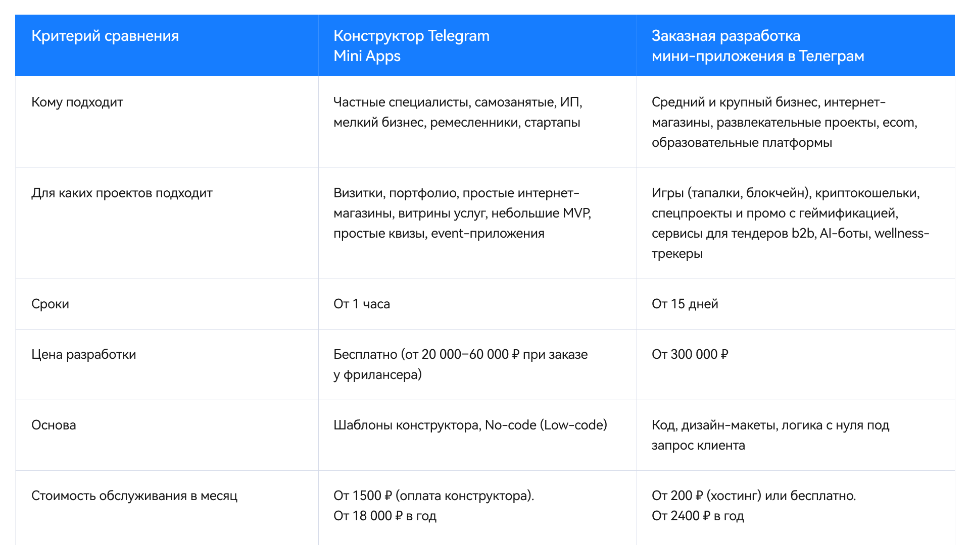 Конструктор Telegram Mini Apps — простое и утилитарное решение для малого бизнеса и ИП. Для enterprise-компаний оно не подходит. Как правило, крупным компаниям нужен полноценный продукт, чтобы физически и юридически он полностью принадлежал им и крутился в их IT-контуре.
