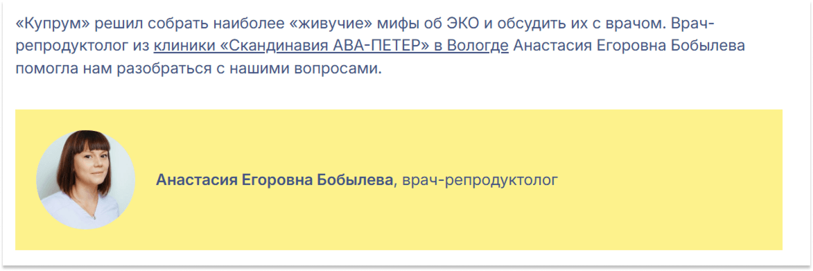 Покажите эксперта. Добавляйте цитаты, комментарии или подписи специалистов. Когда виден конкретный врач, юрист или разработчик, материал вызывает больше доверия, чем обезличенное «мы».