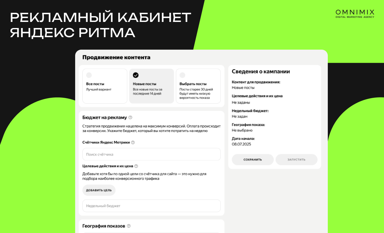 2. Отдельная кампания в Ритме. Этот сценарий используется в случаях, когда бренду требуется самостоятельное управление продвижением внутри платформы без интеграции с РСЯ. При запуске доступна полноценная настройка кампании по следующим параметрам: бюджет, география показов, целевая цена за конверсию и выбор конкретных публикаций, которые будут продвигаться в ленте рекомендаций.