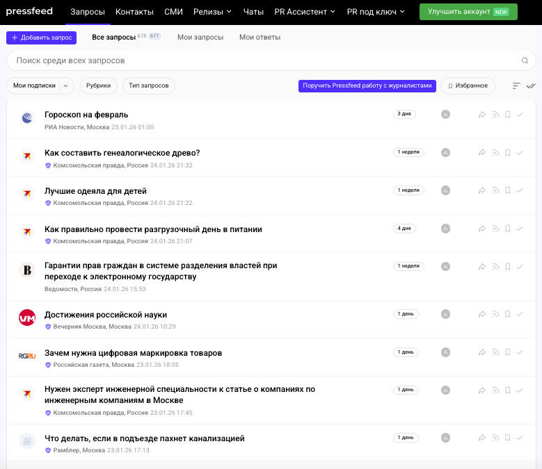 Платформы вроде Pressfeed помогают находить актуальные темы от журналистов, понимать потребности медиа и усиливать охваты за счёт публикаций в СМИ. То есть журналистские запросы фактически становятся источником инфоповодов, а не отдельной задачей «на потом».