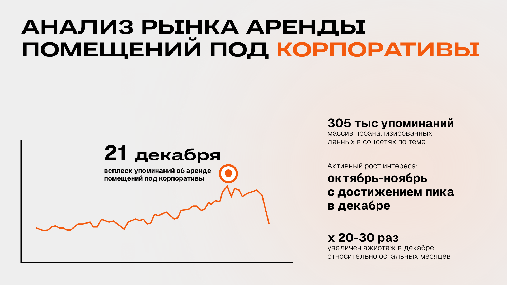 Аналитика соцмедиа проводилась в период с января 2024 по январь 2025 года. Как показали результаты исследования, интерес к аренде помещений начал плавно расти с начала осени и достигла максимума в ноябре-декабре. Всего в течение года тема обсуждалась в интернете 305 тысяч раз, при этом наибольшая активность наблюдалась в предновогодний месяц. Пик наступил 21 декабря — в этот день в дискуссиях участвовало более семи тысяч пользователей. Далее последовал органический спад, а к началу января 2025 года обсуждения плавно сошли на нет.
