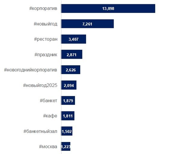Хештеги к постам проставляют, чтобы отнести контент к определенной тематике. Часто в дополнение к ним добавляют геометки, чтобы привязать публикацию к определенному региону. Все это позволило проанализировать интересы аудитории в разрезе проведения новогодних корпоративов. Мониторинг, проведенный Belka Digital, позволил выявить десятку хештегов-лидеров, чаще всего сопровождавших публикации в декабре.