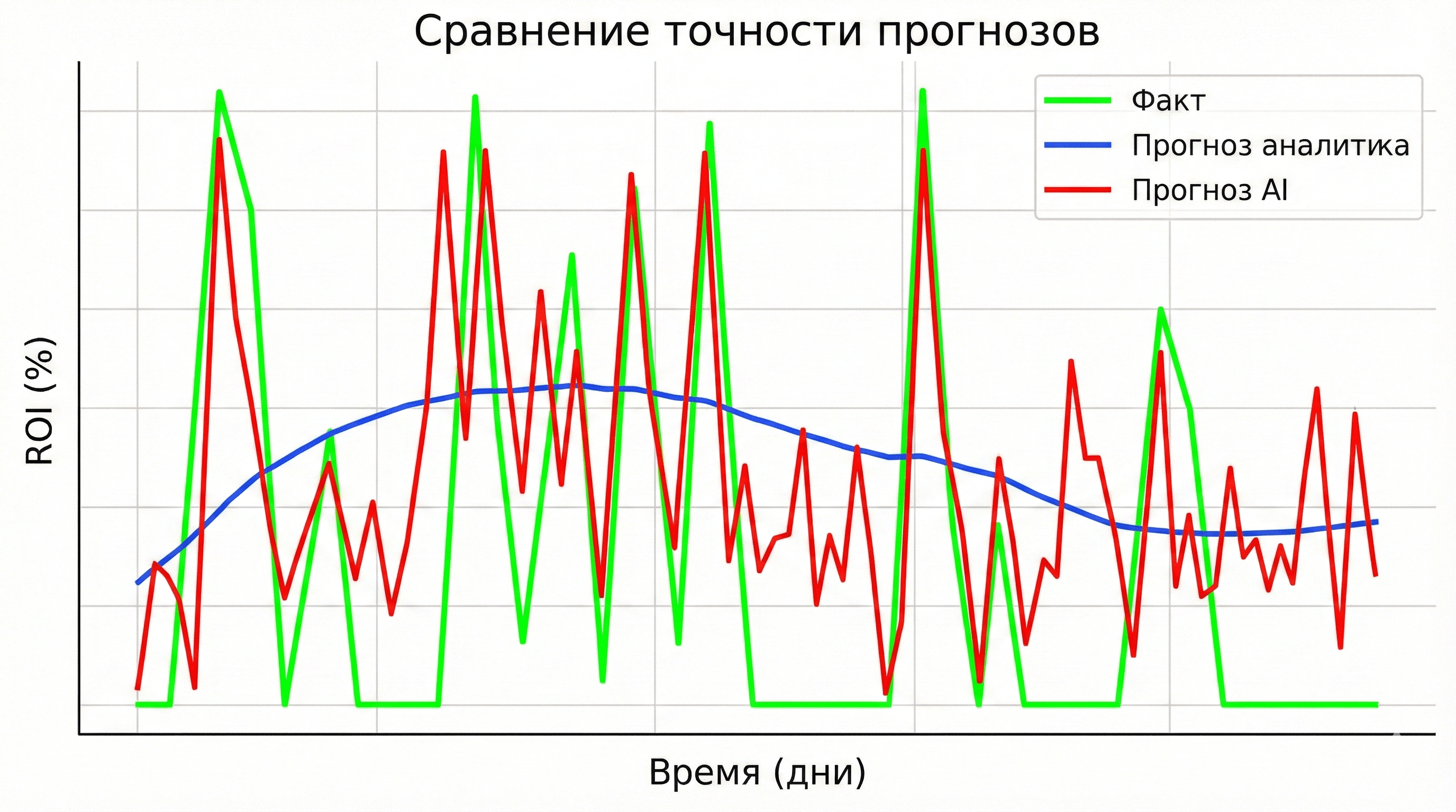 Нейросетевое моделирование продемонстрировало преимущество в тактическом прогнозировании. Алгоритмы обеспечили более высокую точность расчета возврата инвестиций (ROI) на коротких временных интервалах, совпадающих с хайповыми событиями. Способность выявлять микротренды позволила обнаружить возможности для выкупа дешевого трафика в моменты пикового спроса.