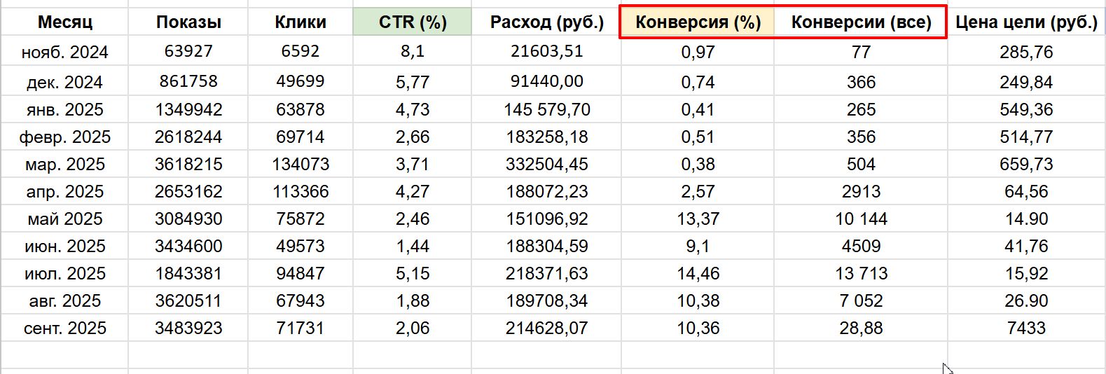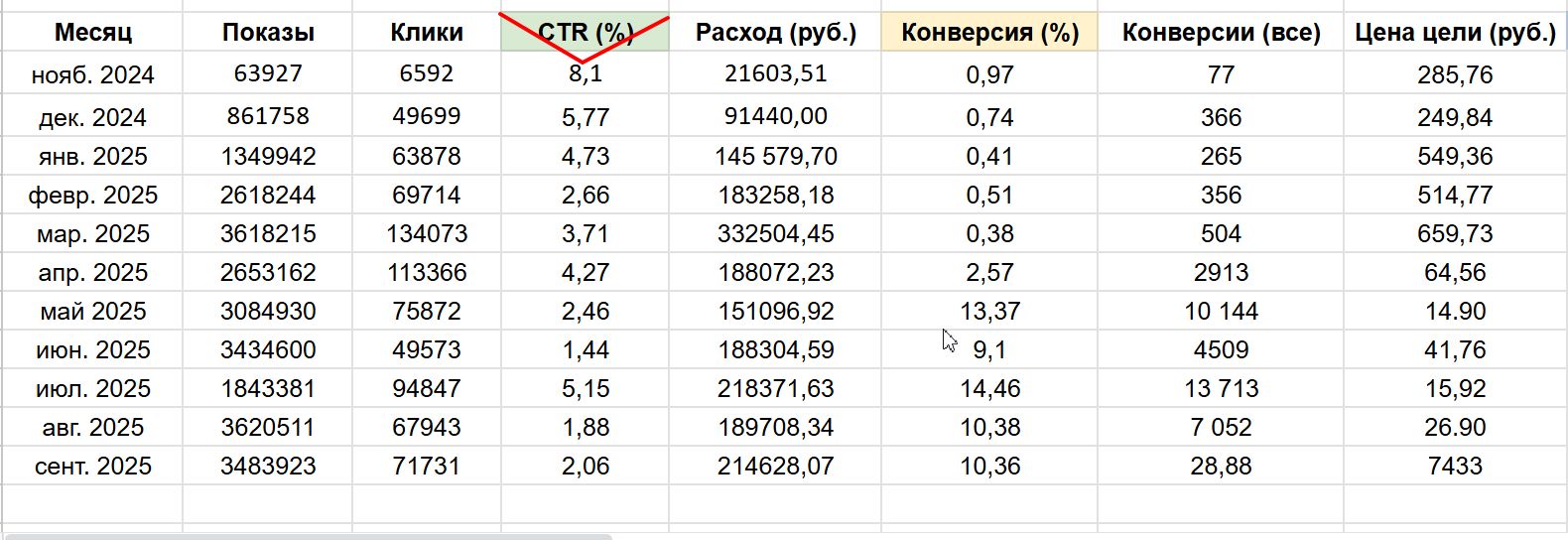 В таблице видим, что CTR в июне и августе ниже планового значения. В этом случаем ставим задачу по смене рекламных текстов и креативов специалисту.