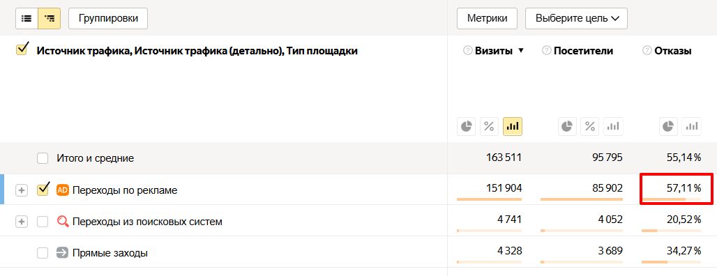 Что показывает: процент посетителей, которые покинули сайт после просмотра одной страницы менее чем за 15 секунд. Высокий показатель (более 40–50%) говорит о проблемах: объявления вводят в заблуждение (в тексте одно, на сайте другое), реклама показывает сайт нецелевой аудитории.