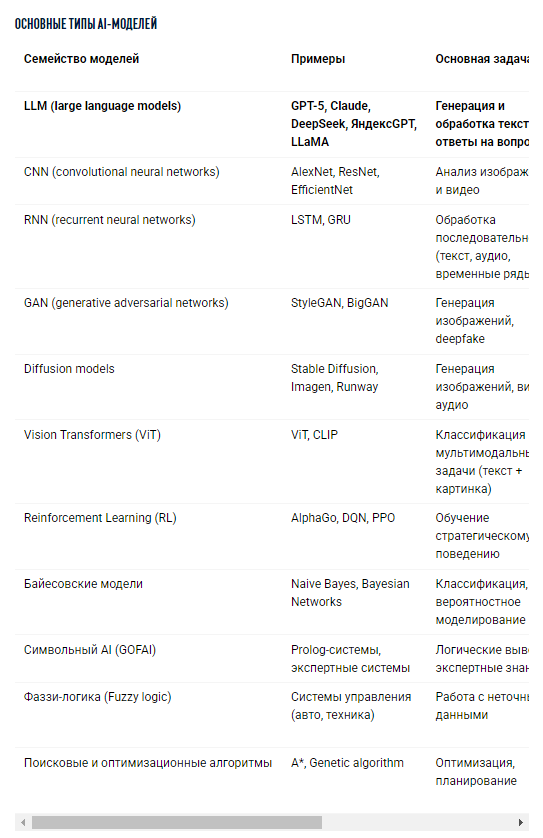 Существует множество моделей искусственного интеллекта. Часть из них является машинным обучением (ML), часть не является. Почти все модели машинного обучения используют нейросети различной архитектуры.Значимым, но не единственным семейством моделей является семейство LLM.