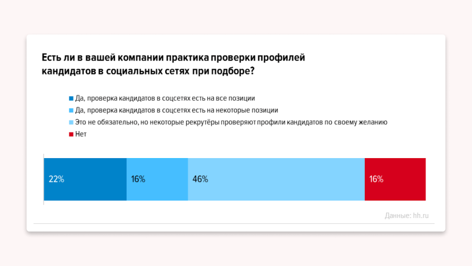 Вас знают. А значит, вы можете получать клиентов и лучшие предложения о работе за счёт бренда. По статистике hh.ru 22% работодателей проверяют социальные сети всех своих сотрудников, 16% – только на некоторые позиции, 46% – по желанию рекрутера. Таким образом, шанс, что потенциальный работодатель не посмотрит ваши аккаунты где-то 2 собеседования из 10. И, конечно, рекрутер предпочтёт человека с раскрученным личным брендом, особенно если речь про топовые позиции.