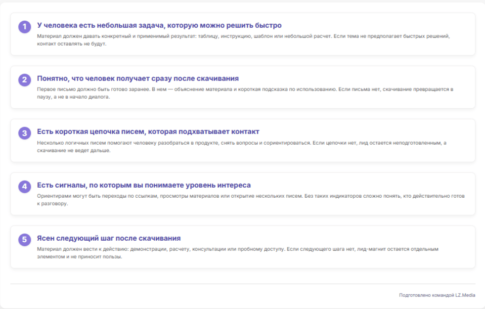 Материал нужно связывать с тем, как вы объясняете ценность продукта. Если ваша сильная сторона — экспертиза, лид-магнит должен показывать ее. Если вы делаете ставку на скорость, человек должен получить быстрый и понятный результат. Когда лид-магнит не совпадает с образом компании, он создает лишние ожидания и снижает доверие.