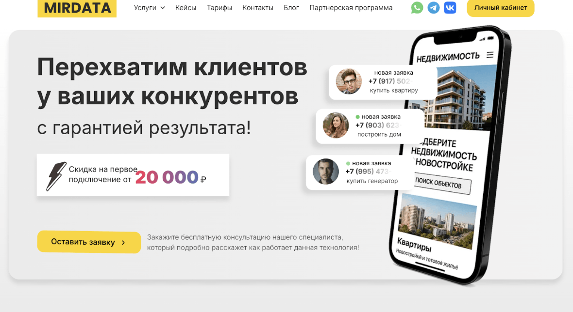 Mirdata — сервис, который позволяет анализировать активность конкурентов и выгружать статистику по категориям Авито. Он помогает увидеть, когда объявления поднимаются в ТОП, сколько просмотров и звонков они собирают, и по каким ключам работают лидеры рынка. Mirdata полезен на подготовительном этапе — для выбора аккаунтов конкурентов перед тестом перехвата лидов.