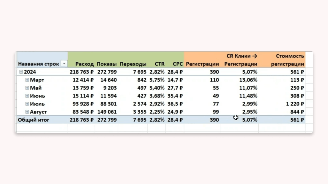 Это позволит видеть эффективность рекламы от недели к неделе и до рекламных кампаний, именно до денег или до качественных лидов.