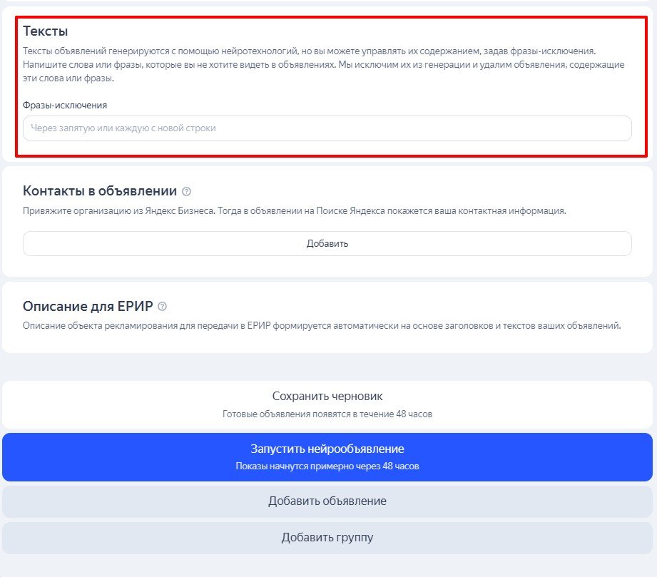 4. При необходимости добавьте минус-фразы, которые не должны использоваться в объявлениях. Прикрепите организацию для отображения контактной информации.