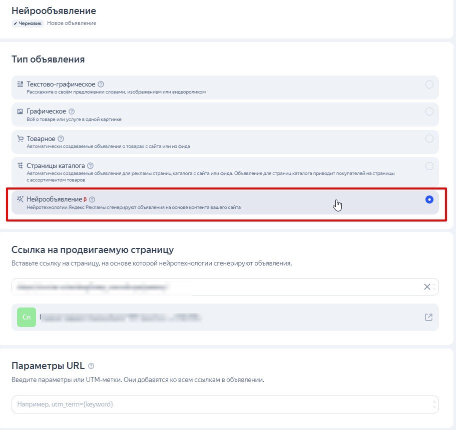 3. В типе объявления выберите "Нейрообъявление". Вставьте URL продвигаемой страницы.