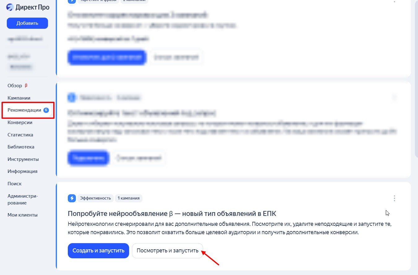 3. Найдите рекомендацию “Попробуйте нейрообъявление β — новый тип объявлений в ЕПК”.