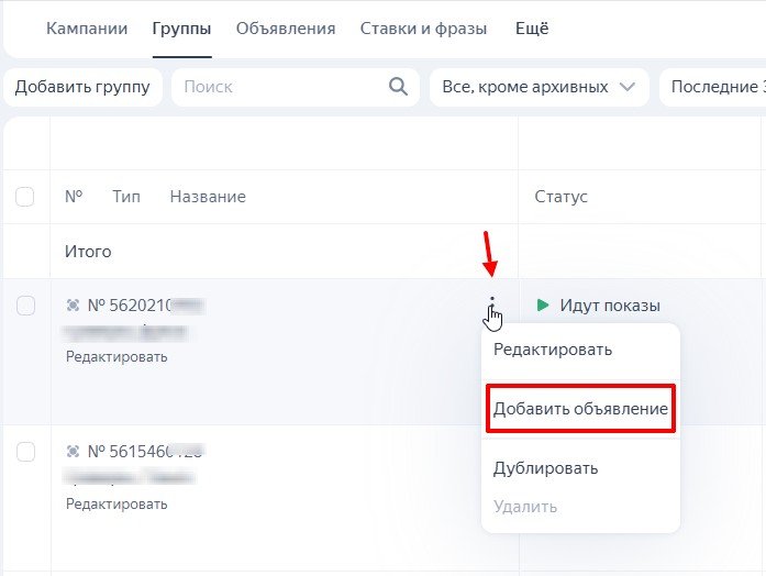2. Найдите подходящую группу объявлений. Нажмите на "⋮" (три точки) рядом с группой. Выберите "Добавить объявление".