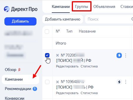 1. В левом меню выберите "Кампании". Откройте вкладку "Группы объявлений".