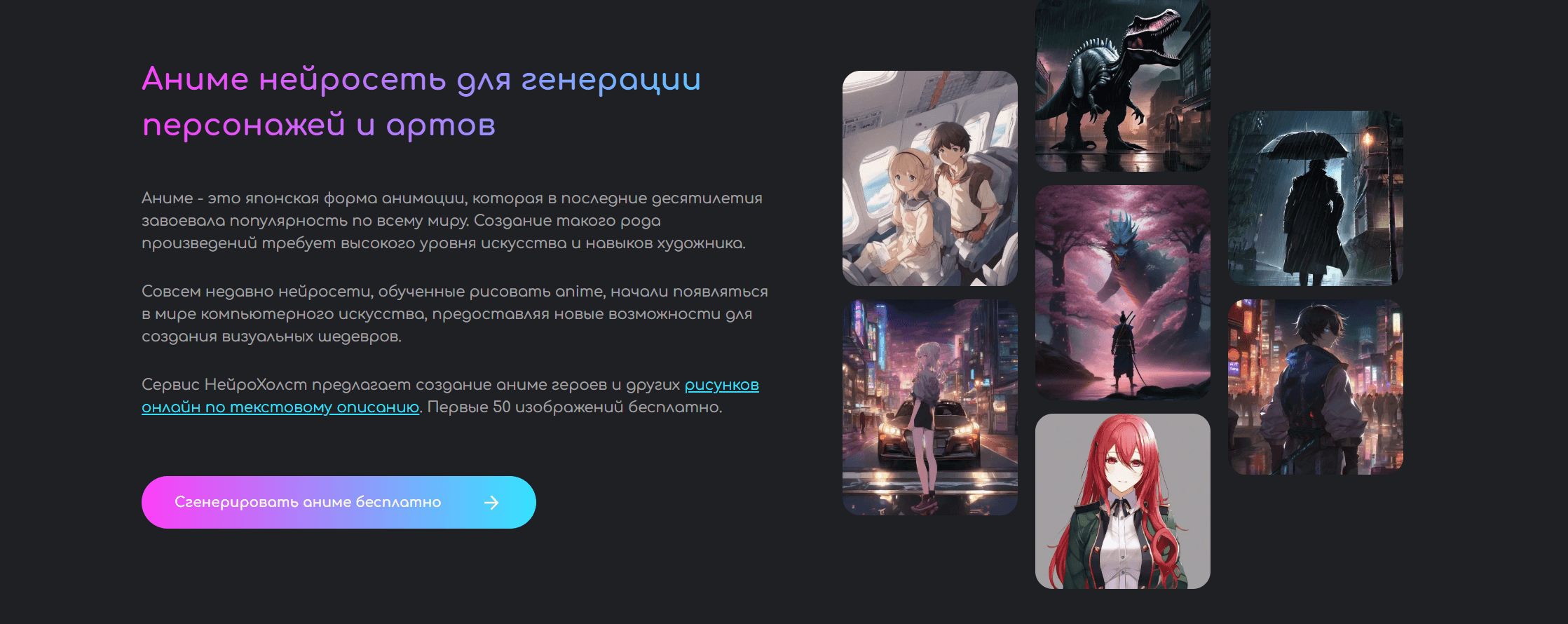 Neuro-Holst — это высококачественная нейросеть для создания аниме изображений и артов. Платформа позволяет преобразовывать фотографии в стиль аниме с минимальными усилиями, предоставляя множество настроек, включая выбор стиля, эмоций и даже анатомических деталей персонажей. В отличие от множества сервисов, Neuro-Holst предлагает возможность генерировать изображения с элементами уникального дизайна, что позволяет создать действительно оригинальные и яркие аниме-работы.