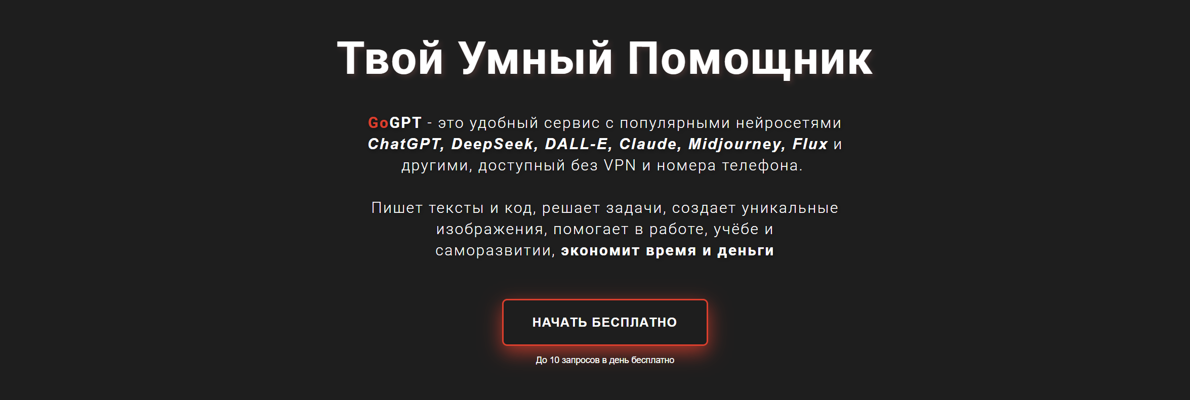 GoGPT — это один из самых простых и быстрых способов получить доступ к GPT-4 на русском языке. Он позиционируется как нейросеть для написания текста онлайн: минималистичный интерфейс, мгновенный запуск, нет регистрации, нет перегрузки настройками. Подходит для тех, кто хочет быстро “gpt написать статью” без заморочек. Особенно удобен для студентов, маркетологов и SMM-специалистов, которым важна скорость и доступность.