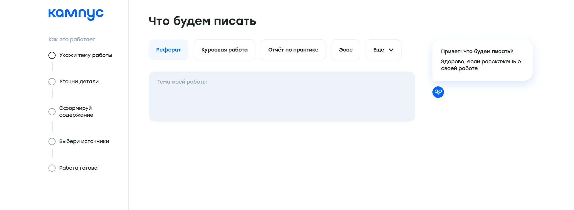 Эта нейросеть для написания статьи подойдёт студентам, аспирантам, преподавателям и авторам научных работ. Kampus особенно хорош как ИИ для создания текста в академическом формате. Минус — бесплатный функционал ограничен, и для полноценных исследований всё же потребуется подписка.