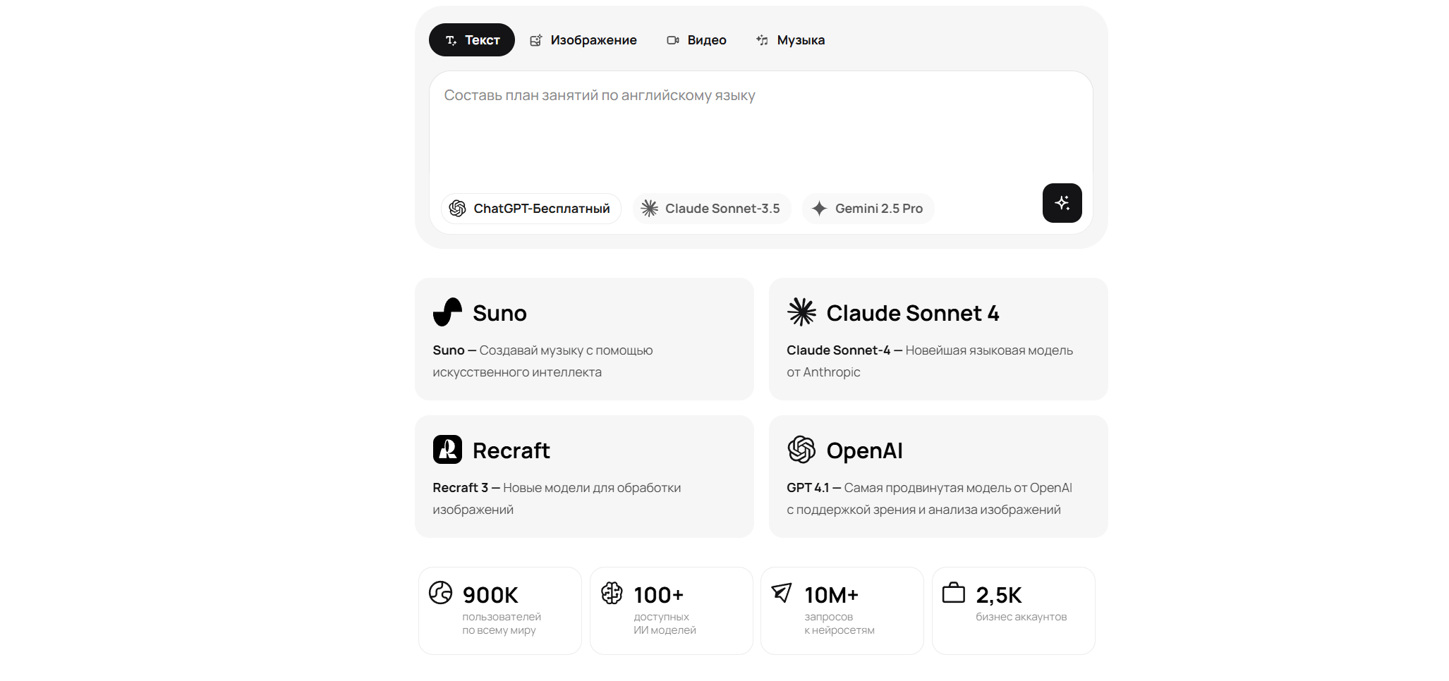 GPTunnel — это портал, объединяющий десятки нейросетей в одном окне. Он служит своеобразным хабом, через который можно подключаться к GPT, Claude, Grok и другим продвинутым ИИ. Сервис выделяется поддержкой различных языковых моделей и гибкой системой токенов. Это мощный инструмент для тех, кто пишет много, часто и разнообразно. GPTunnel особенно удобен для генерации статей, написания текстов на заказ, креативных описаний и аналитических обзоров. Работает без VPN, интерфейс полностью на русском, что делает его идеальным выбором для копирайтеров и редакторов.
