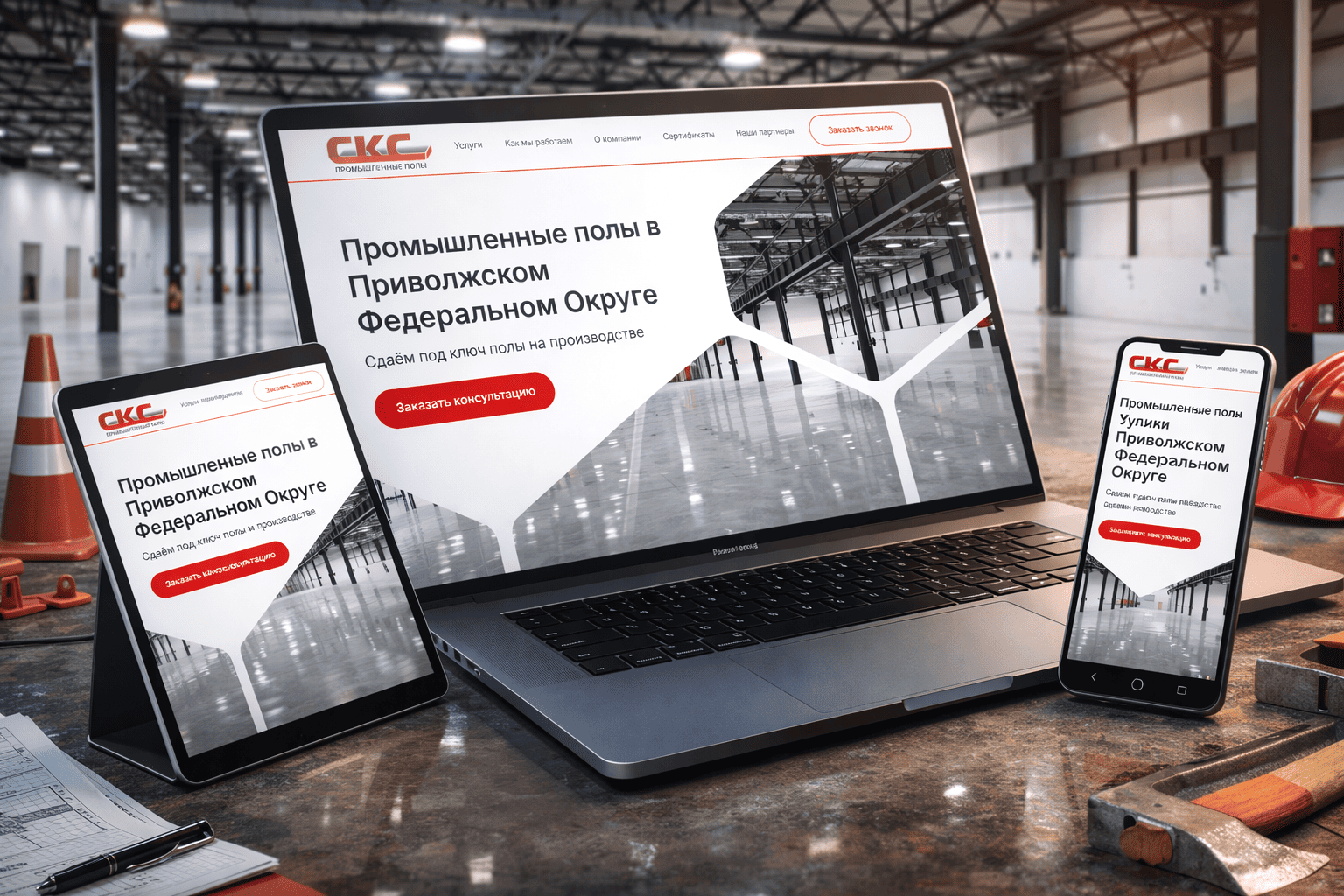 Портал Sks-prompol.ru с первого экрана задает рамку ответственности через визуал готового объекта. Пустое производственное пространство, очищенное до металлоконструкций и света, показывает финальное состояние площадки. Для собственника предприятия подобный сигнал считывается однозначно: подрядчик мыслит запуском линий, сроками ввода и деньгами, которые начнут работать после сдачи пола. Лучшие сайты для строителей на рынке индустриальных напольных покрытий выигрывают конкуренцию за счет качества входящего трафика.