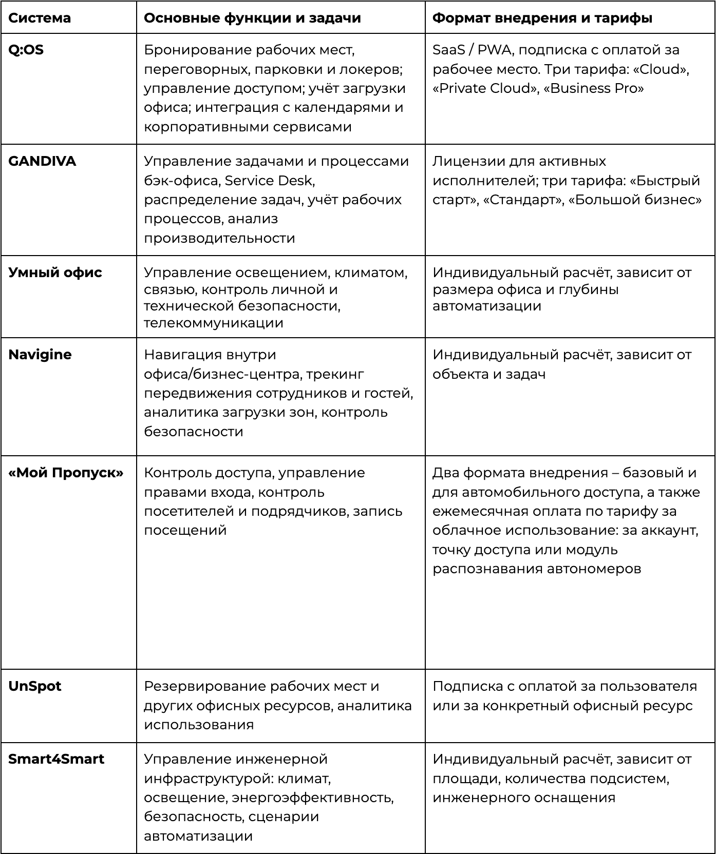 Цифровые системы меняют эту экономику, предлагая решения разного уровня: от инструментов для бронирования рабочих мест до платформ, которые управляют климатом, эксплуатацией или пропускной системой.