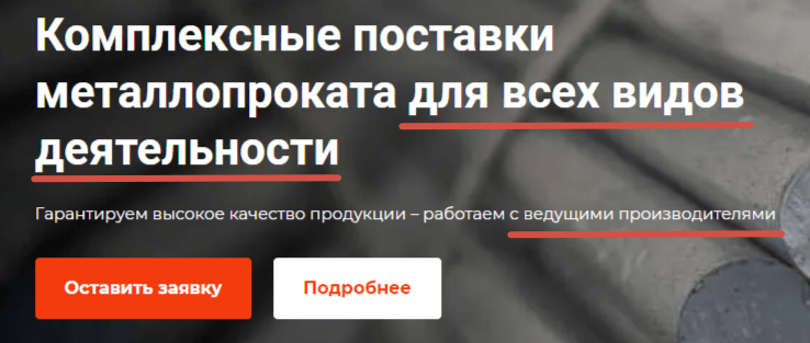 Сформулировать ценностное предложение не так уж и сложно – практически любое условие сотрудничества можно обратить в преимущество. Например, в заголовке вместо «Поставки металлопроката» напишите «Комплексные поставки для всех видов деятельности», что отразит универсальность вашего товара.