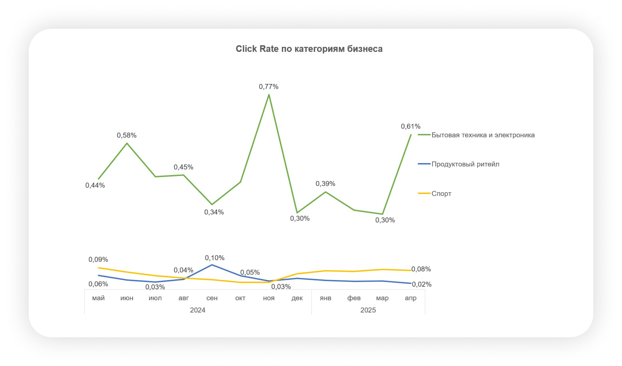 Категория «Бытовая техника и электроника» показывает устойчиво высокий уровень вовлеченности на протяжении всего года. Open Rate держится на уровне 3,5–5,3%, а Click Rate стабильно выше среднего — до 0,77%. Это один из немногих сегментов, где email остается не просто каналом информирования, а активным каналом продаж. Пользователи здесь внимательно читают письма и охотно переходят по ссылкам, особенно в конце месяца, когда появляются финальные предложения и скидки.