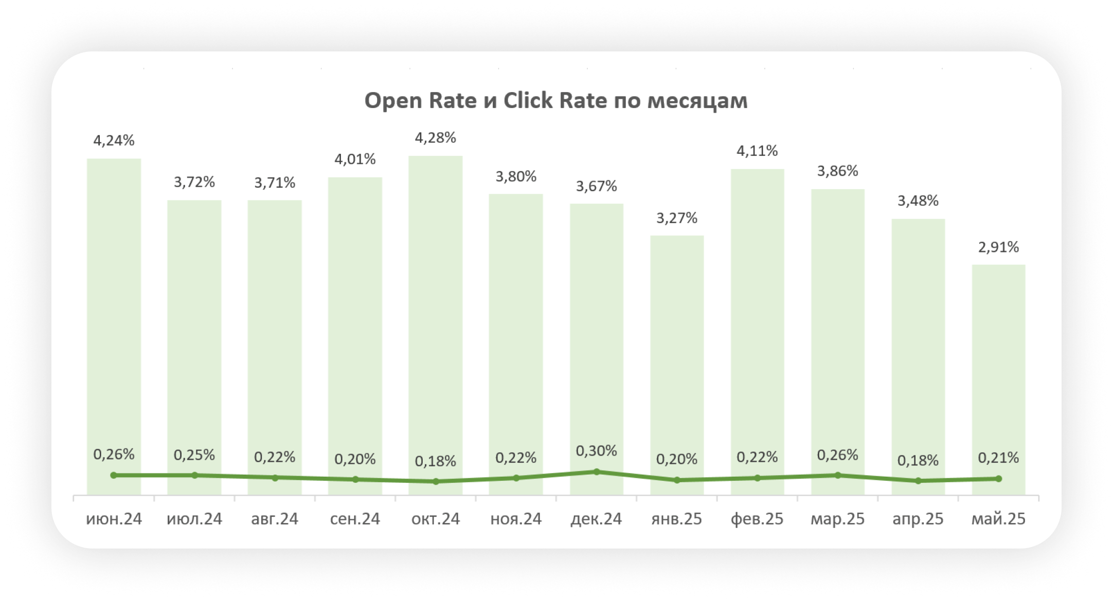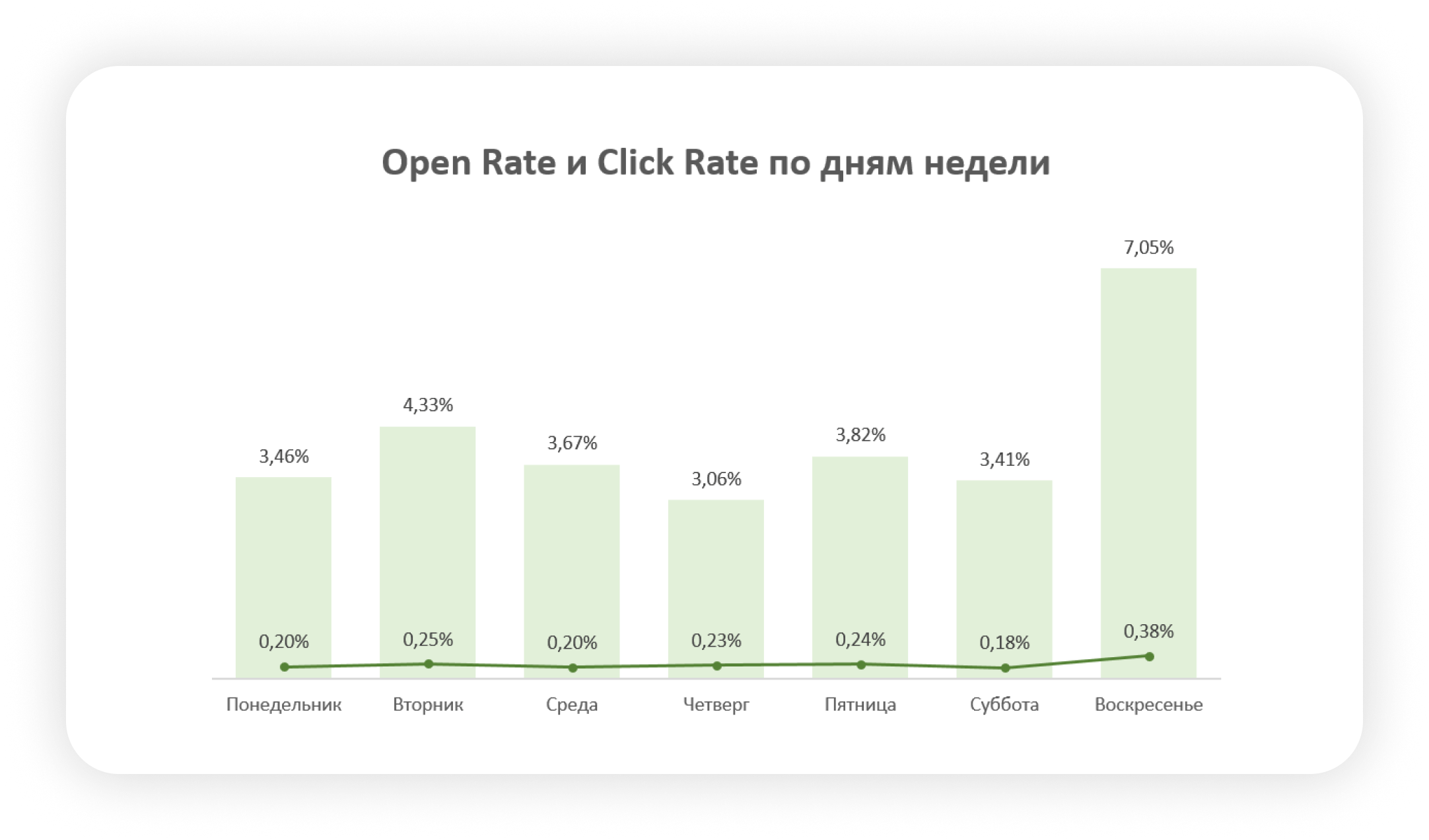 Интересно, что в воскресенье люди охотно читают и кликают: Click Rate достигает 0,38%, тогда как в будни он почти в два раза ниже. Это может быть связано с тем, что в выходные люди готовы спокойно прочитать письмо и перейти по ссылке без рабочего напряжения.